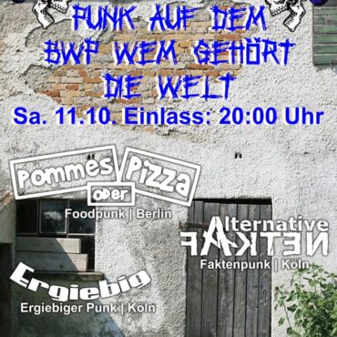 11 Okt. 2025BWP — KölnPunk auf den BWP – Wem Gehört Die Welt Alternative FaktenErgiebigPommes oder Pizza Mehr Info